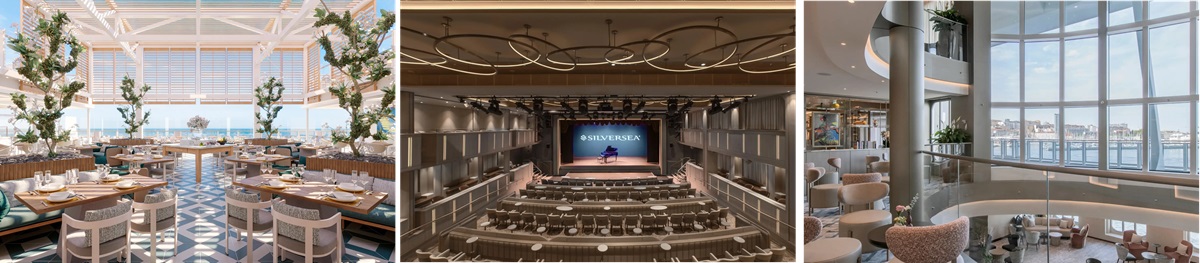Silversea radikálne porušila tradičné pravidlá uvedením asymetrického rozloženia, ktoré maximalizuje vonkajšie a verejné priestory, ponúka bezkonkurenčný výhľad na oceán a plynulý prechod medzi interiérmi a exteriérmi. Nočná mora pre inžinierov, ale zato významné vylepšenie pre hostí. Najväčší bazén vo flotile Silversea s rozsiahlou slnečnou terasou s dostatkom lehátok pre všetkých hostí, priestranný sky barom pod otvoreným nebom a veľkolepý salónik Venetian Lounge, kde sa divadlo a hudba striedajú so zábavnými predstaveniami a celovečernými filmami.